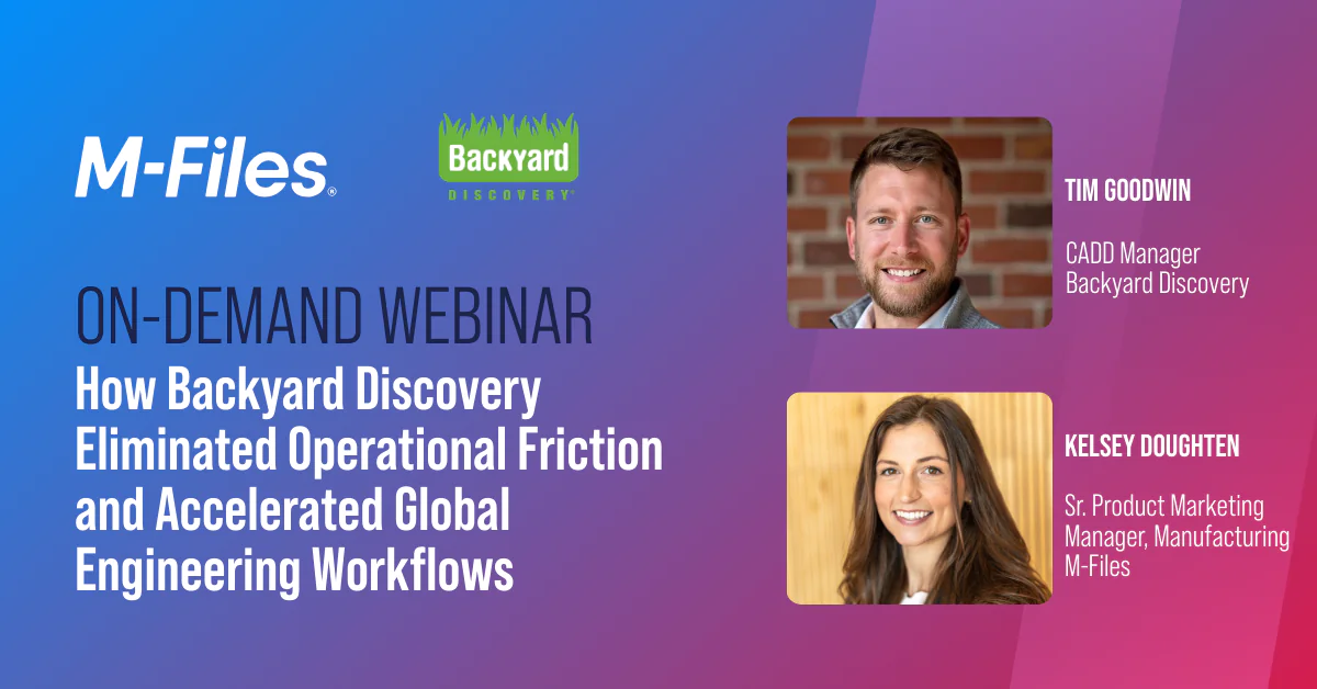Vea este seminario web bajo demanda para descubrir cómo Backyard Discovery, un fabricante mundial de productos para exteriores, transformó sus procesos de modificación técnica con M-Files, el sistema de gestión documental «Context-First». Al integrar planos, listas de materiales, documentación de pruebas y flujos de trabajo en un sistema de registro unificado, Backyard Discovery redujo los tiempos de ciclo, reforzó la auditabilidad y permitió a los equipos distribuidos trabajar con mayor rapidez y confianza.