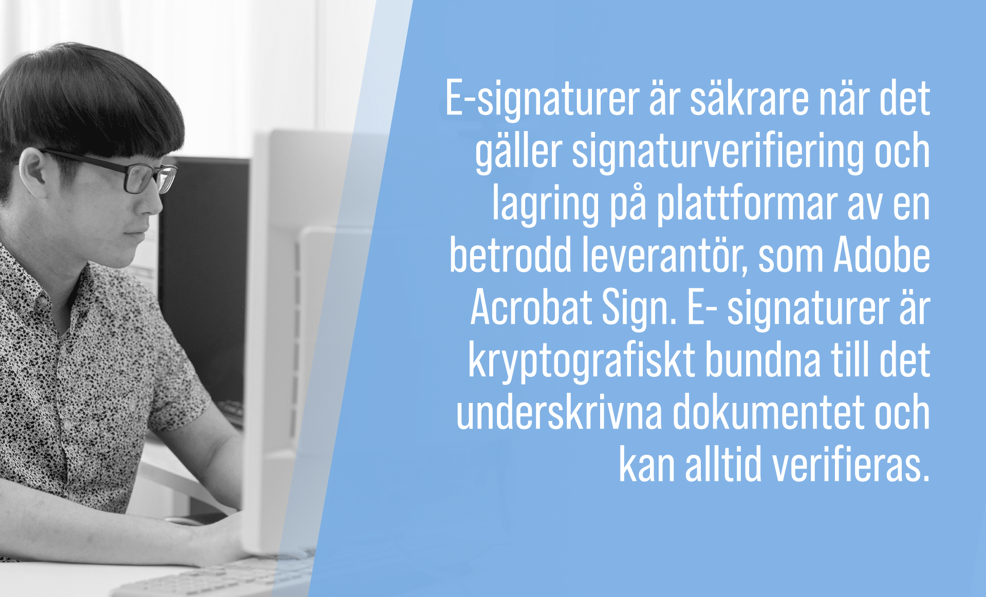 E-signaturer erbjuder mer robust säkerhet för signaturverifiering och lagring när de skapas av en betrodd leverantör, t.ex. Adobe Acrobat Sign. E-signaturer är kryptografiskt bundna till det signerade dokumentet och kan alltid verifieras.